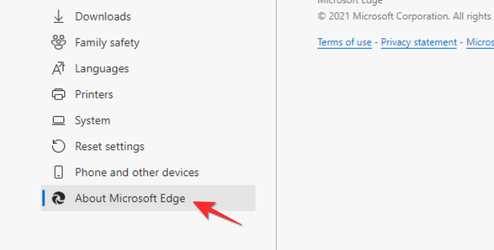 从进入“设置”菜单后出现的左侧菜单面板中,单击“关于 Microsoft Edge”选项。