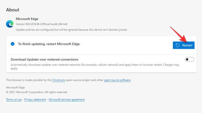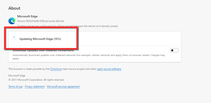 等待下载更新。当您单击关于 Microsoft Edge 时,它将自动启动。