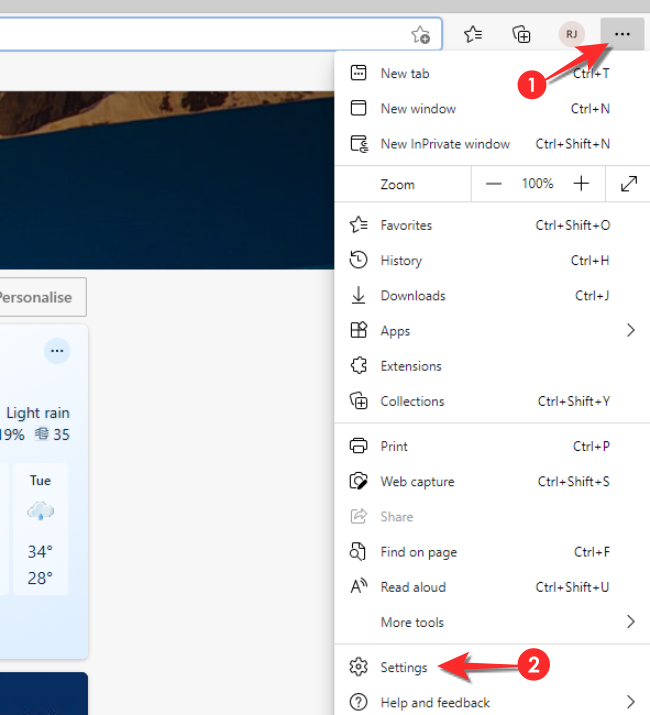 启动 Microsoft Edge 浏览器并单击屏幕右上角的水平三点菜单,然后单击设置选项。