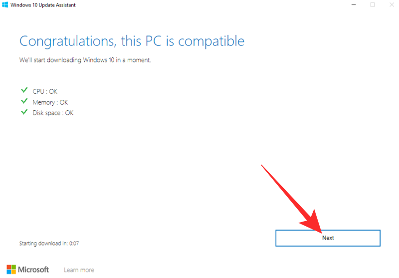 它将执行快速检查并告诉您您的 PC 是否已准备好进行更新。它还将启动 10 秒计时器。如果您想跳到下载,请单击“下一步”。