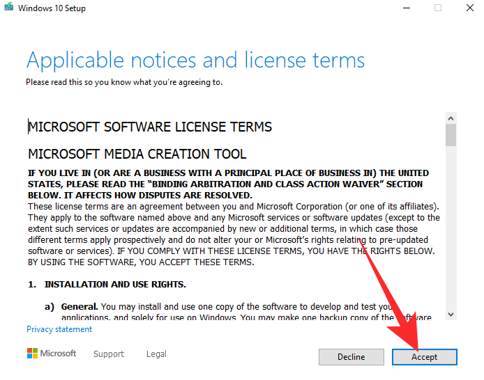 下载后,双击打开。媒体创建工具会向您抛出条款和条件。单击“接受”开始。