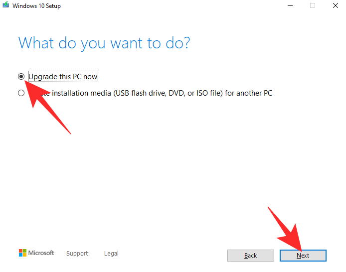 一切就绪后,媒体创建工具将为您提供升级 PC 或创建安装媒体的选项。在这种情况下,我们将选择前者并单击“下一步”。