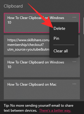 要查看、使用和删除以前的副本,您需要打开剪贴板并从那里取出。点击“Windows + V”调出剪贴板菜单。获得包含所有副本的小窗口后,单击复制项目右侧的省略号按钮以访问溢出菜单。在顶部,可以选择删除该特定条目。单击“删除”以执行此操作。