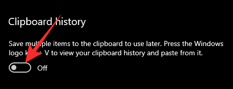 如果你想阻止 Windows 10 跟踪你以前的副本,你可以简单地要求它停止记住你的东西。为此,只需点击“剪贴板历史记录”下的切换按钮即可完成。