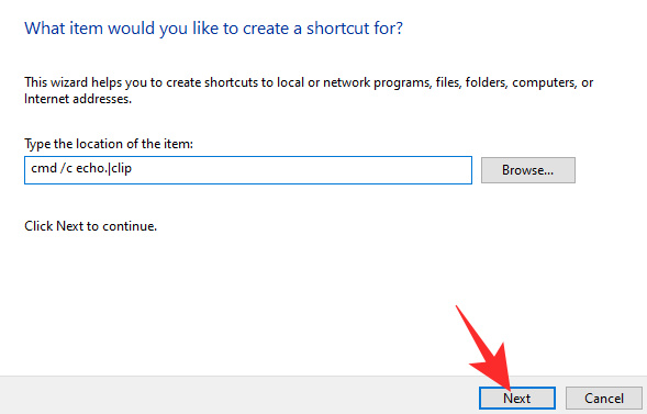 Windows 会要求您添加快捷方式的来源。放下“cmd /c echo.|clip”并点击“下一步”。