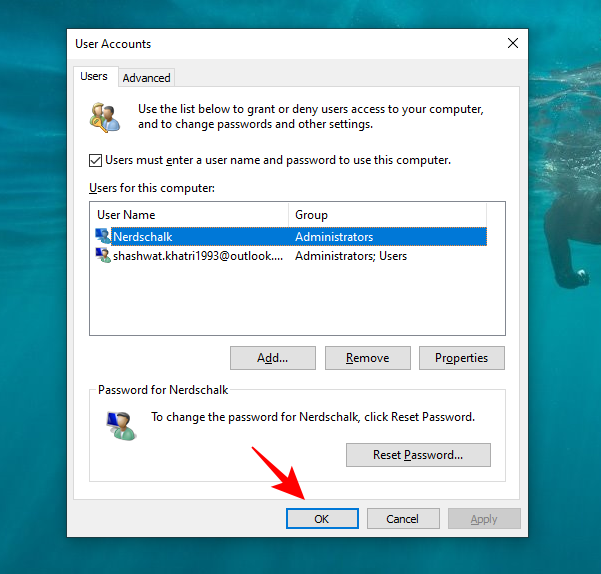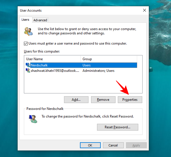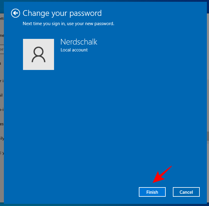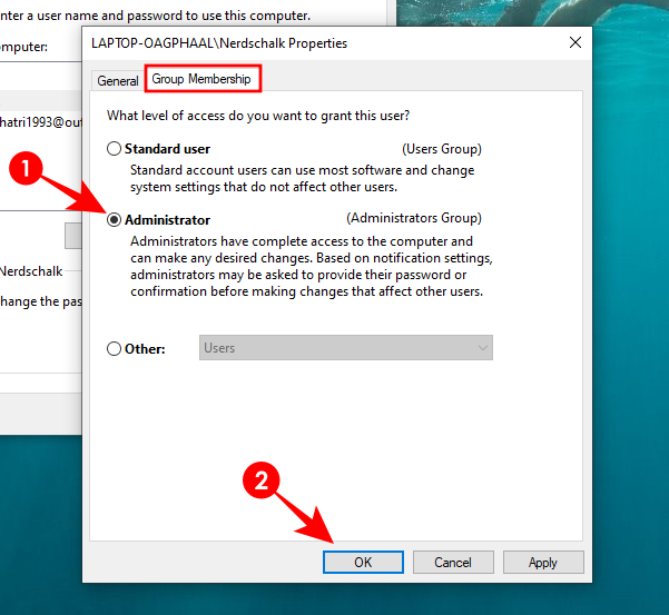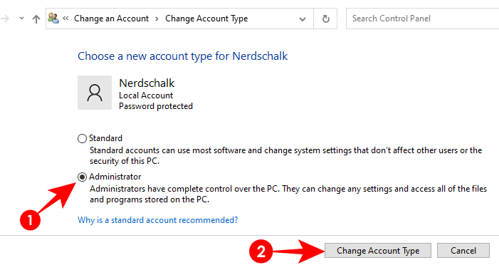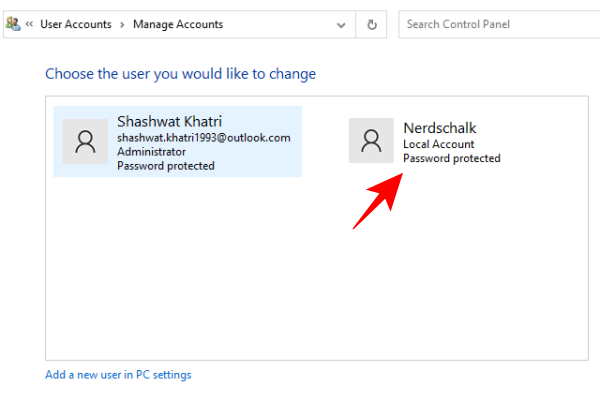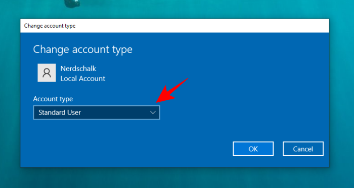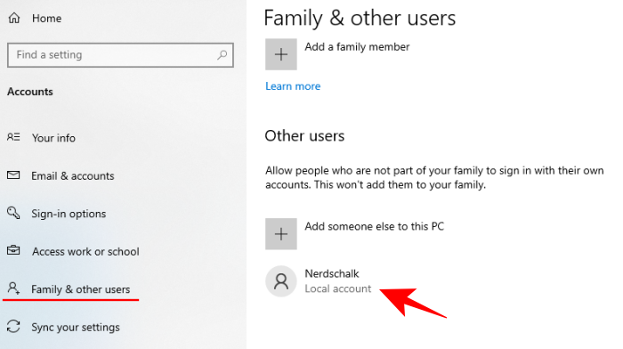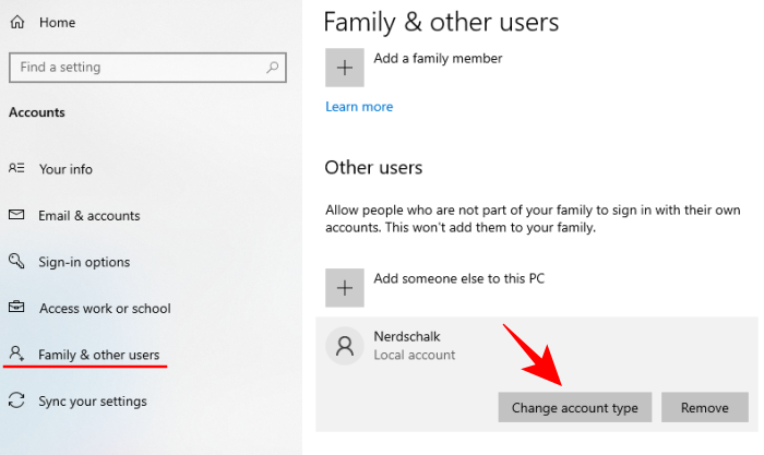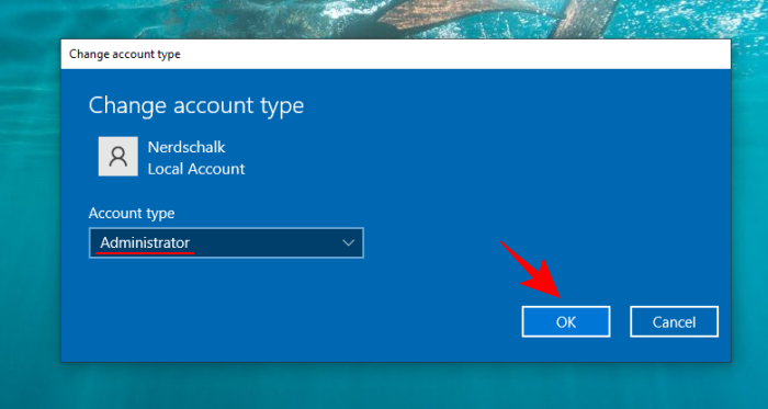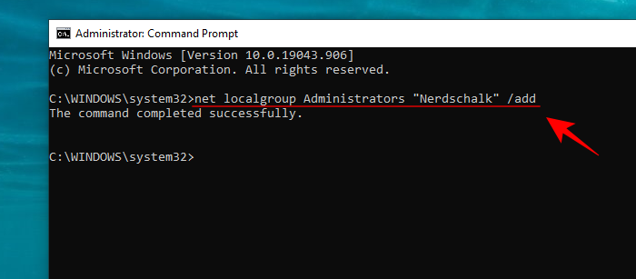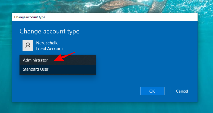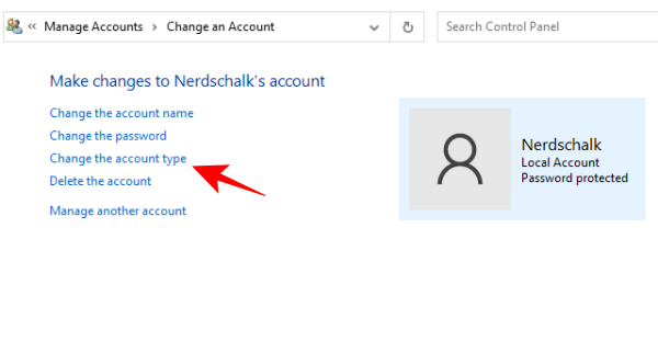 您可以继续使用前面提到的任何方法(通过 cmd、PowerShell、控制面板、设置或 netplwiz)为您的标准帐户(在我们的示例中为 Nerdschalk)授予完整的管理员权限和特权。