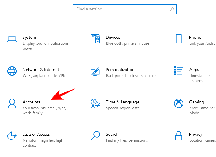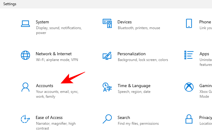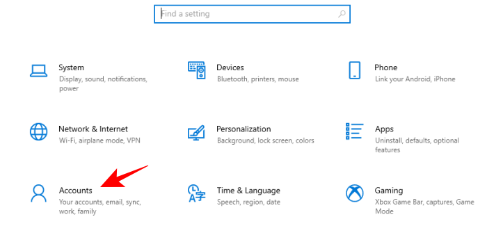 另一种方法是切换到本地帐户,然后返回 Microsoft 帐户(使用您的新电子邮件地址)。为此,请按 Win+I 打开 Settings 并单击 Accounts。