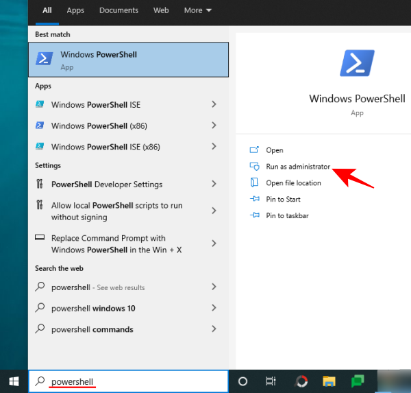 按 开始,键入“PowerShell”,然后单击 以管理员身份运行。