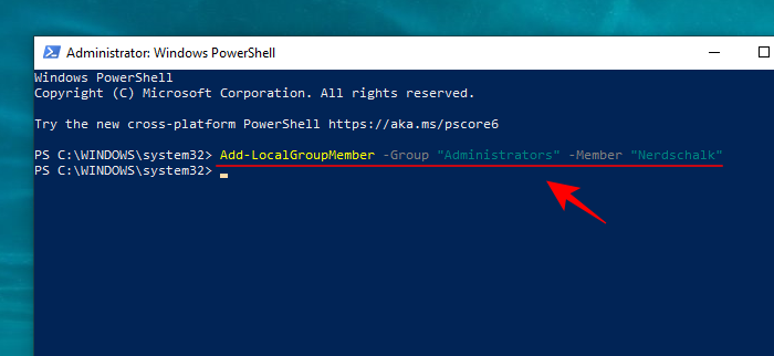 Add-LocalGroupMember -Group "Administrators" -Member "Nerdschalk"