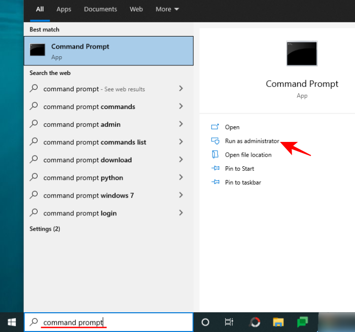 按开始,键入“命令提示符”,然后单击以管理员身份运行。
