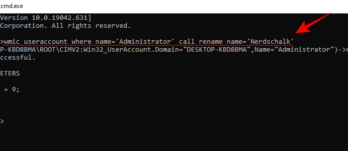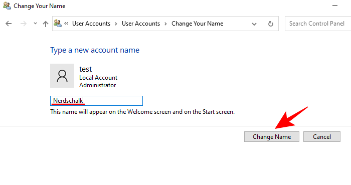确保将 NewName 替换为所需的帐户名称。在我们的示例中,我们已将帐户名称更改为 Nerdschalk。