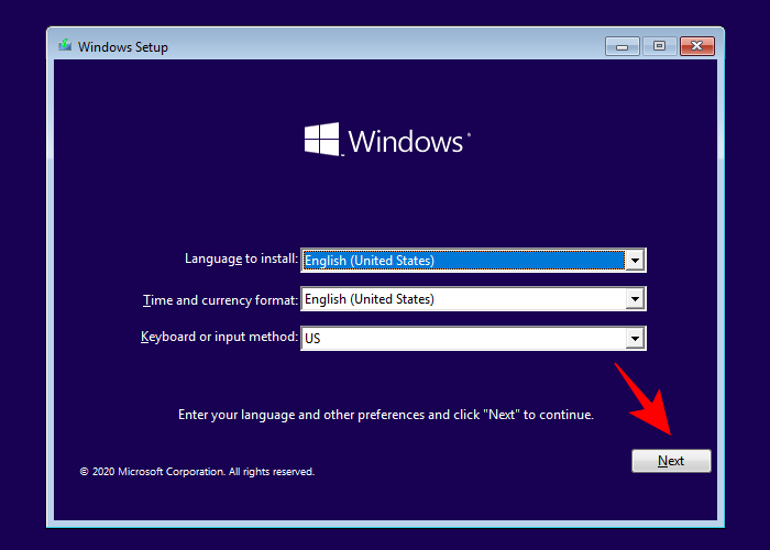 在以下屏幕上,按Shift + F10启动命令提示符。或者,单击 下一步。