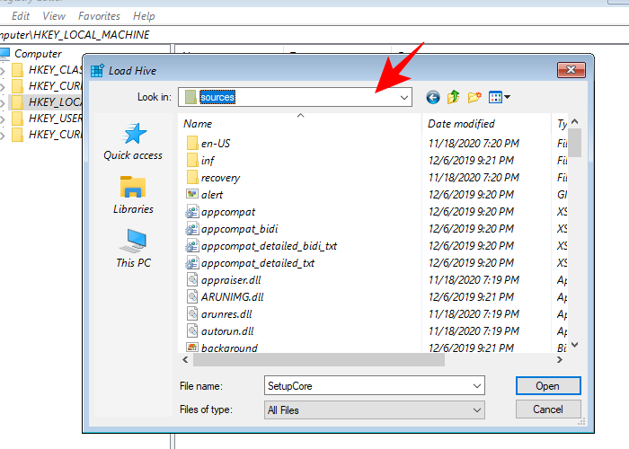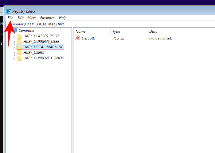 这将打开“注册表编辑器”。现在单击并突出显示HKEY_LOCAL_MACHINE,然后单击 File。