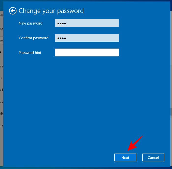 输入您的新密码(两次)、密码提示,然后单击 下一步。