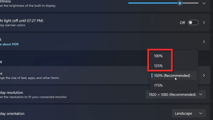 默认百分比可能为 150%,这就是为什么所有内容都如此之大,从弹出菜单到任务栏图标以及其他所有内容。只需从下拉列表中选择较小的百分比,即 125% 或 100%,具体取决于您的屏幕大小和您喜欢的字体。单击您选择的百分比刻度。