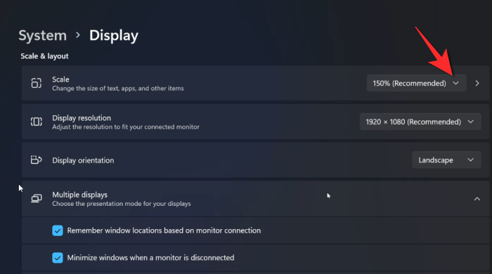显示设置现在将打开。向下滚动到缩放和布局部分,然后对于缩放选项,单击带有百分比的下拉菜单。