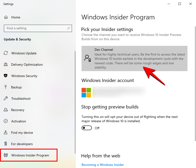 确保您注册并选择加入您的 PC 以运行 Insider Preview 版本。当提示更新时,选择进入开发频道。