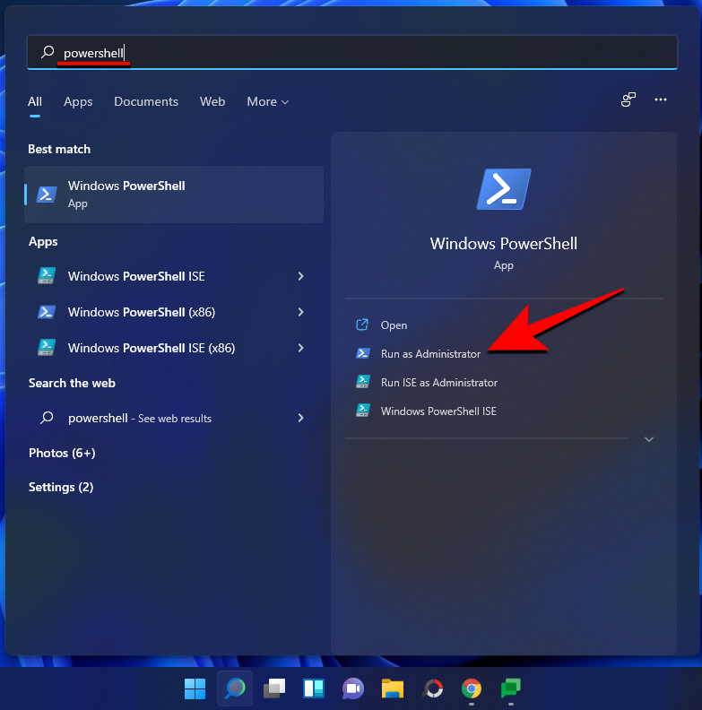 按开始,键入 PowerShell,然后单击 以管理员身份运行。