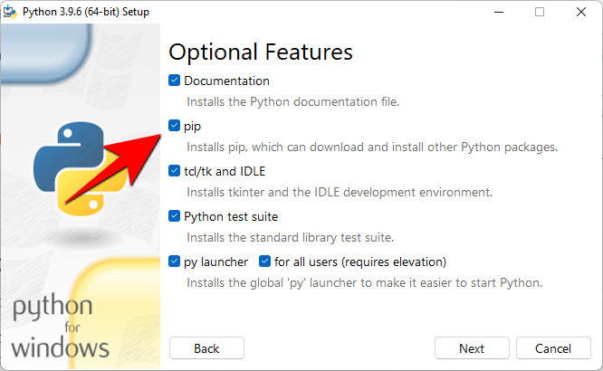 在这里,确保“pip”旁边有一个勾号以确保它被安装。