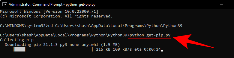 现在,要安装 PIP,请打开前面显示的命令提示符。通过键入以下命令将当前路径目录更改为保存文件的目录,然后按 Enter: