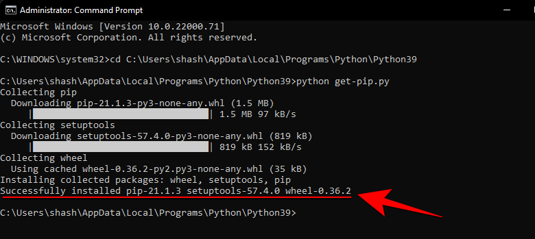 等待安装过程完成。完成后,您将看到“成功安装 pip…”消息。