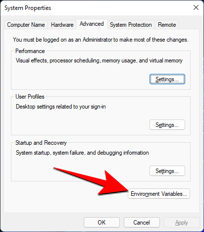 按开始并搜索System Environment Variables,然后单击第一个选项。
