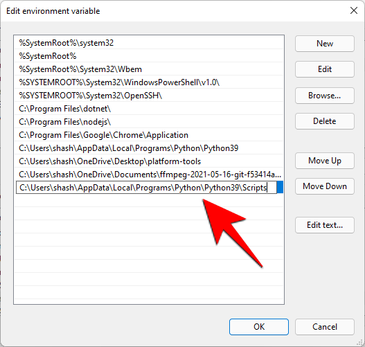 然后添加安装“PIP”的位置。默认情况下这是C:\Users\(username)\AppData\Local\Programs\Python\Python39\Scripts