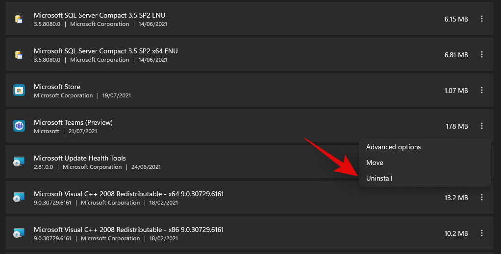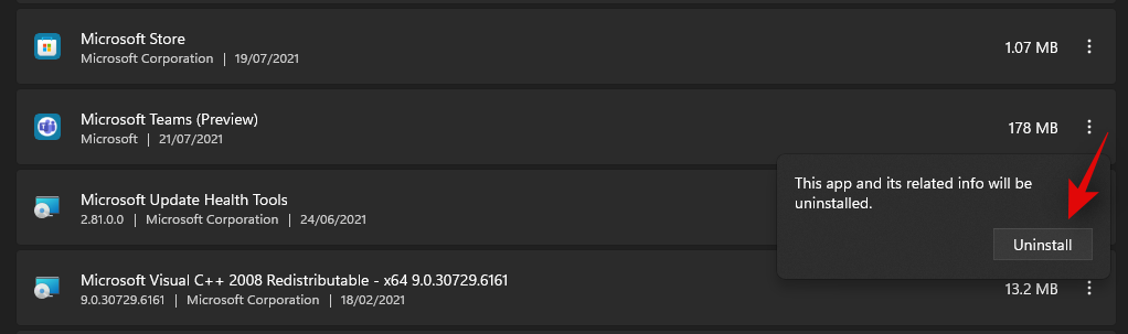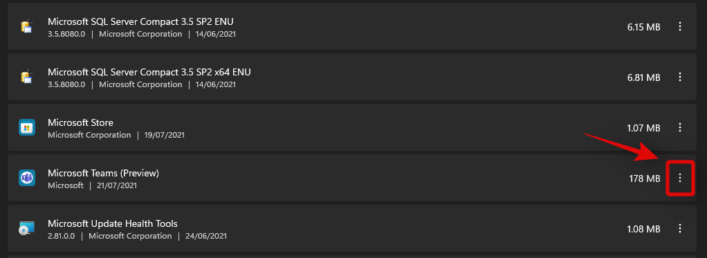 滚动系统上安装的应用程序列表,然后单击“Microsoft Teams(预览版)”旁边的“三点”图标。