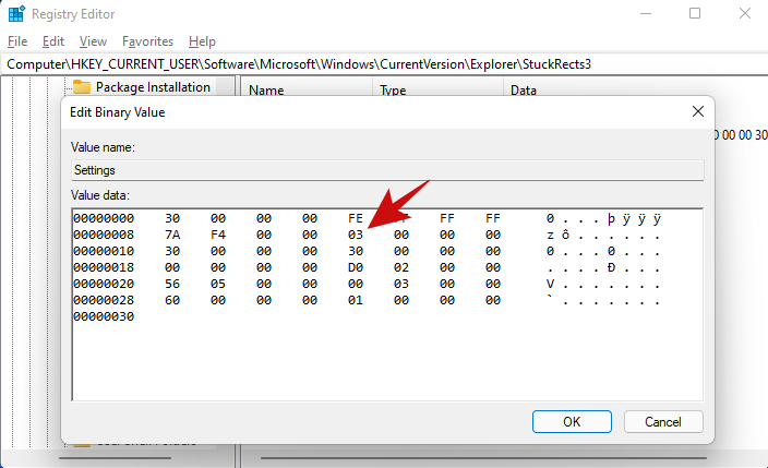 在此屏幕上,确保双击“FE”下的“03”值并输入“01”。您本质上要做的是用 01 替换之前的值,即 03。这里,03 指的是底部位置,而 01 指的是顶部位置。