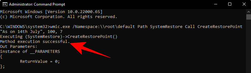 将Restore Point Name上面的命令替换为您希望调用的任何还原点。当您收到“方法执行成功”和“ReturnValue=0”消息时,您的系统还原点已成功创建。