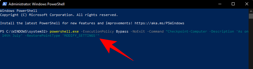 powershell.exe -ExecutionPolicy Bypass -NoExit -Command "Checkpoint-Computer -Description 'Restore Point Name' -RestorePointType 'MODIFY_SETTINGS'"
