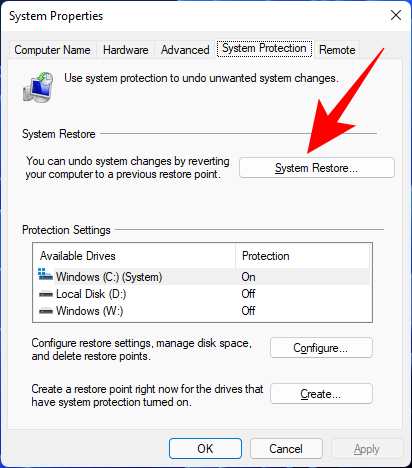 这将打开系统属性窗口。在这里,单击“ 系统还原”。
