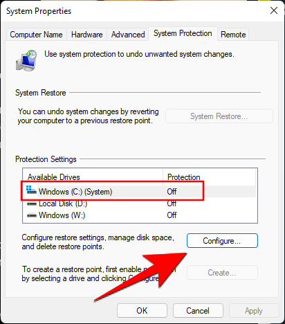 这将打开系统属性窗口。选择系统驱动器并单击“ 配置”。