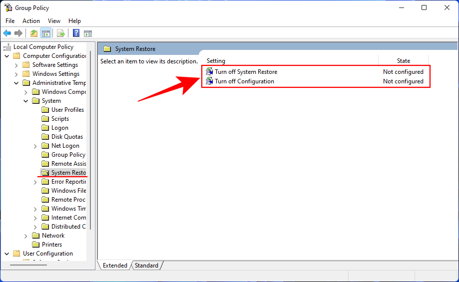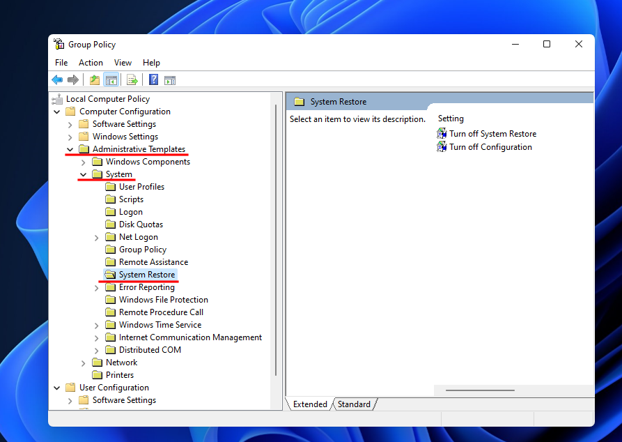 这将打开组策略编辑器。在左侧面板中,导航到管理模板 > 系统 > 系统还原。