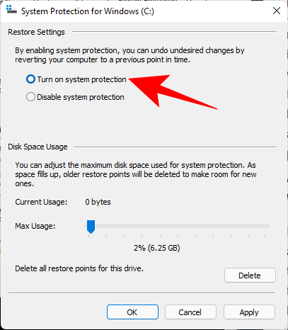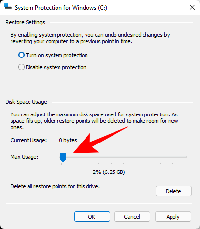 Windows 将自动为系统还原点自动分配磁盘空间。但是您可以更改系统保护可以使用的磁盘空间量。为此,请移动“磁盘空间使用情况”下的滑块以自行分配磁盘空间。