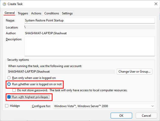 现在,在“常规”选项卡下,为该任务命名,然后选择“无论用户是否登录都运行”和“以最高权限运行”。