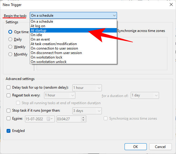 现在,单击“开始此任务”旁边的下拉菜单,然后选择“ 启动时”。