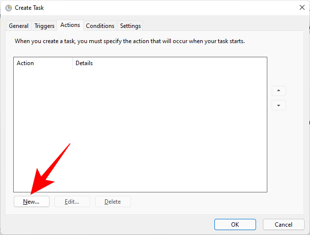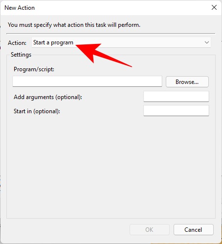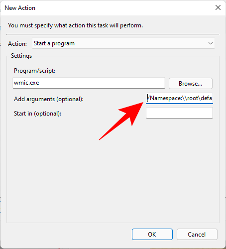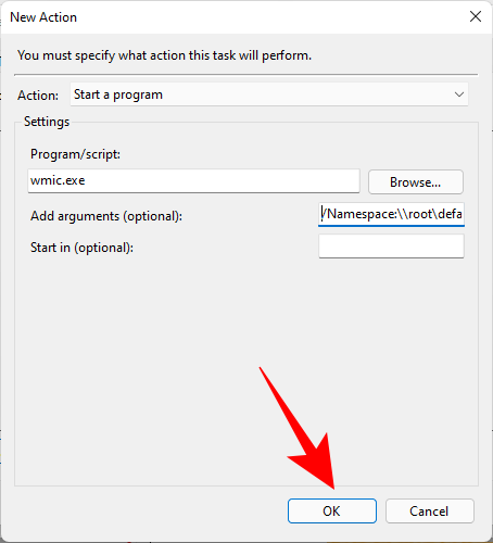 在这里,我们将使用一些参数来运行 Windows Management Instrumentation Control Program 并让它知道需要采取哪些操作。在“新建操作”窗口中,确保操作是“启动程序”(默认)。