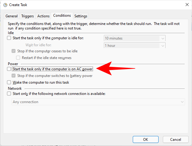 如果您使用的是膝上型电脑,请取消选中“电源”下的“仅当计算机使用交流电源时启动任务”选项 。然后单击 确定。