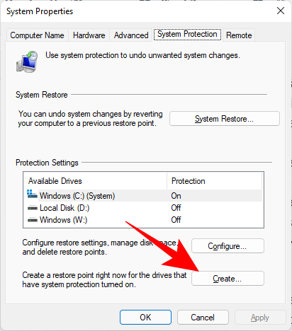这将打开系统属性窗口。单击底部的 创建 按钮。