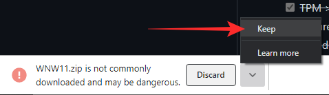 正如我们所讨论的,“WhyNotWin11”并非来自受信任的开发人员,这就是 Google Chrome 会向您发出警告的原因。您需要单击向下箭头并按“保留”将文件保存到硬盘驱动器。