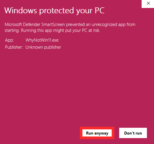 现在,双击下载的文件WhyNotWin11 运行该应用程序。单击“更多信息”,然后单击“仍然运行”以打开应用程序。(是的,正如上面的免责声明中提到的,它存在风险,因为这不是官方的 Microsoft 应用程序。)