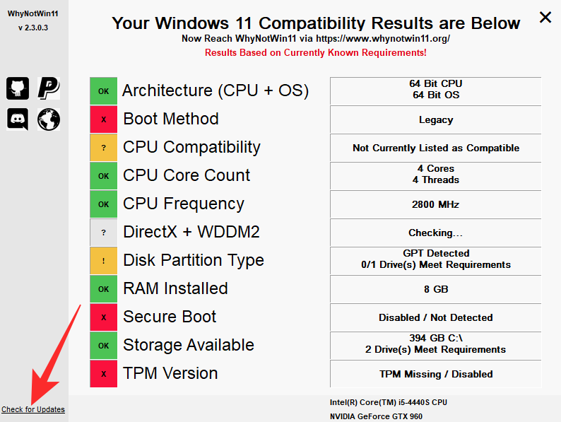 由于距离 Windows 11 的稳定版本还有几个月的时间,系统要求可能仍会发生变化。为确保“WhyNot11”符合当前系统要求,您需要不时单击“检查更新”按钮并允许应用程序加载最新版本。
