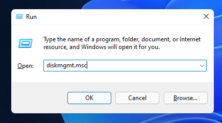 首先,按 Win+R 打开 RUN 框。键入diskmgmt.msc 并按 Enter。