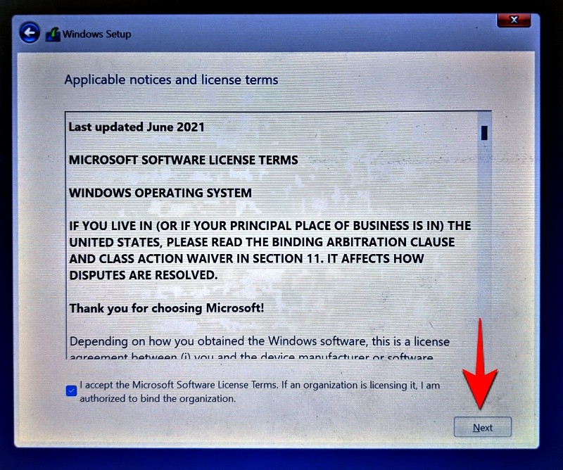 Windows 11 安装程序应该开始。单击下一步 继续。