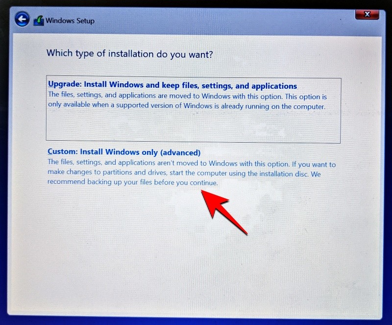 现在 – 这是重要的一点 – 单击 Custom: Install Windows only (advanced)。
