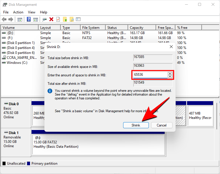 在这里,您将看到可用于收缩的空间。您需要至少有 64 GB 的空间,因此请确保您选择了可以分配那么多空间的磁盘。现在输入要收缩的空间量(以 MB 为单位)。然后点击 收缩。