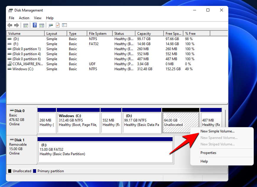 您现在将在磁盘管理中看到未分配的空间。右键单击它并选择 New Simple Volume。