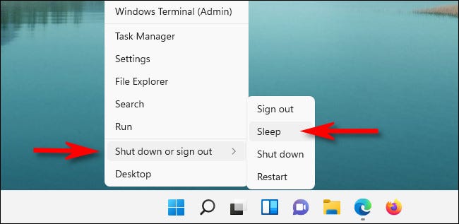 您还可以使用Windows 11 中的高级用户菜单让您的计算机进入睡眠状态。右键单击“开始”按钮,然后在出现的菜单中选择“关机或注销”,然后选择“睡眠”。您疲惫的 PC 将立即进入睡眠状态。