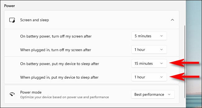 您还可以让您的 Windows 11 PC在一段时间后自动进入睡眠状态。为此,请按 Windows+i 打开“设置”应用,然后选择“系统”>“电源和电池”。在“屏幕和睡眠”部分中,单击“使用电池供电,让我的设备在此之后进入睡眠状态”或“插入电源后,让我的设备在此之后进入睡眠状态”旁边的下拉菜单,然后选择一个时间段,例如“ 15分钟。” 如果您的 PC 在您设置的时间段内保持空闲状态,它将进入睡眠模式